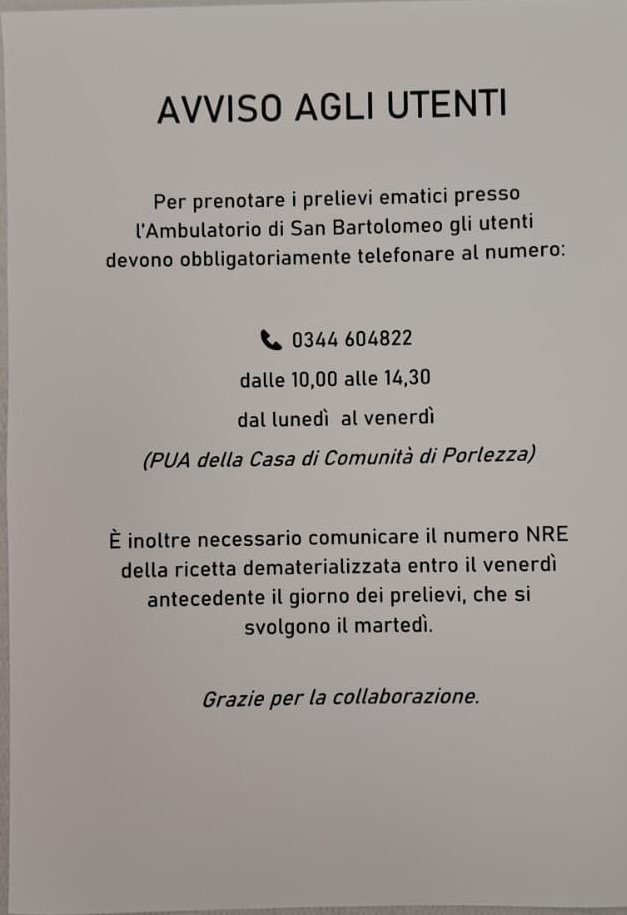 PUNTO PRELIEVI SAN BARTOLOMEO VAL CAVARGNA_nuovo numero telefonico per gli appuntamenti e nuova modalità.